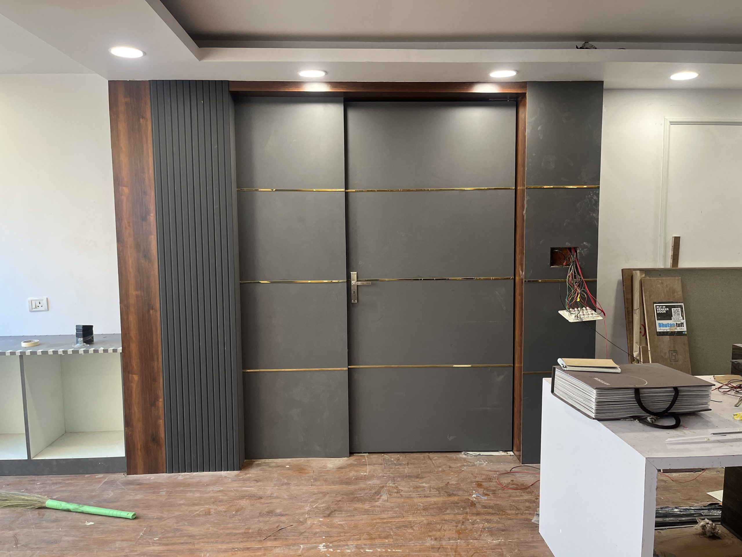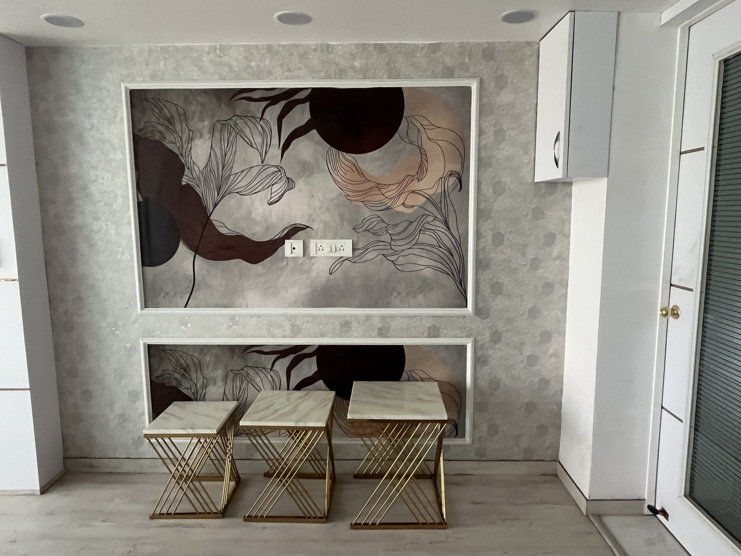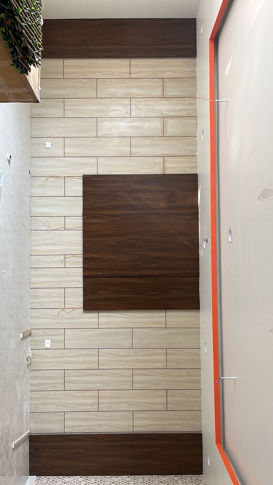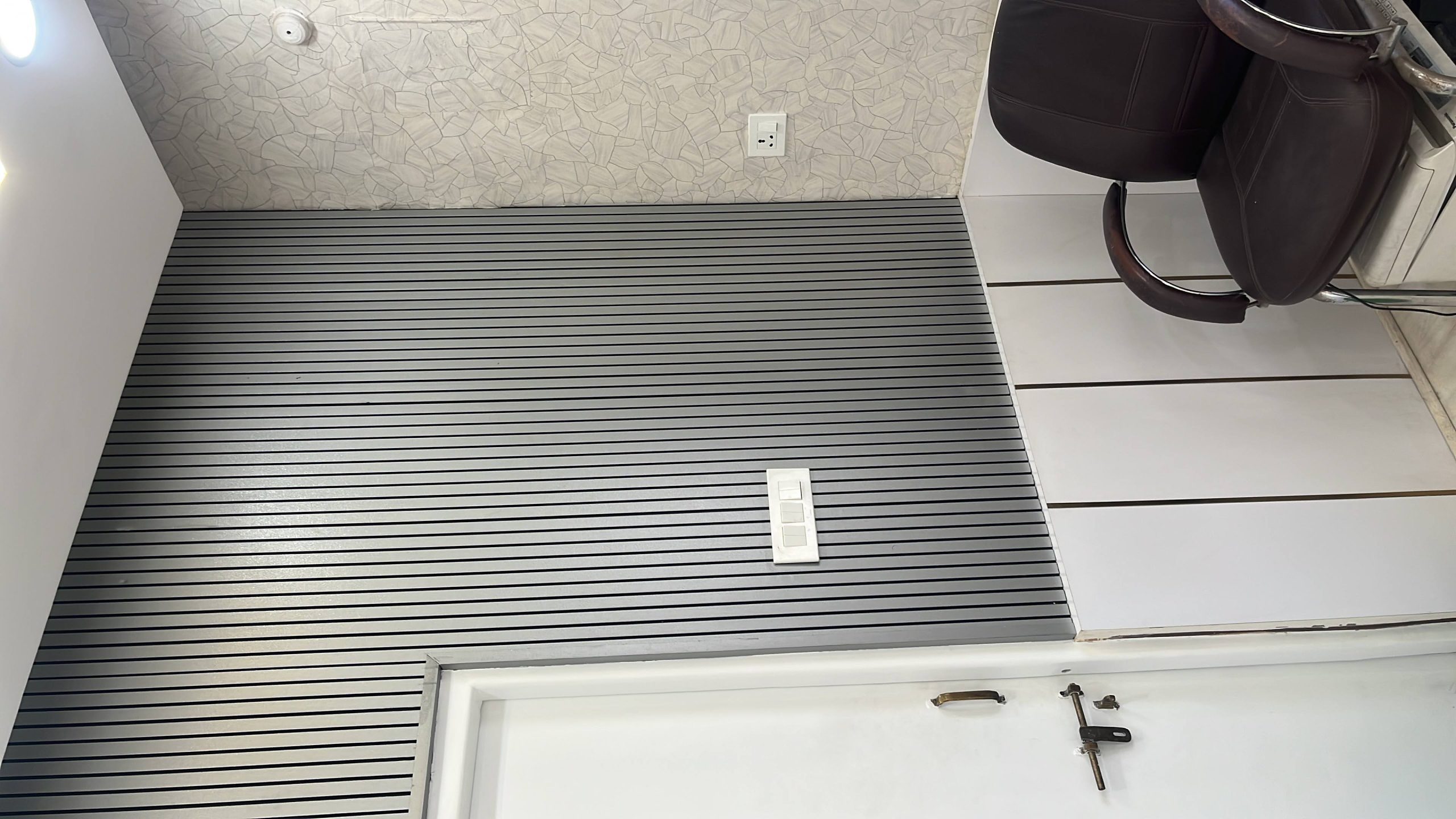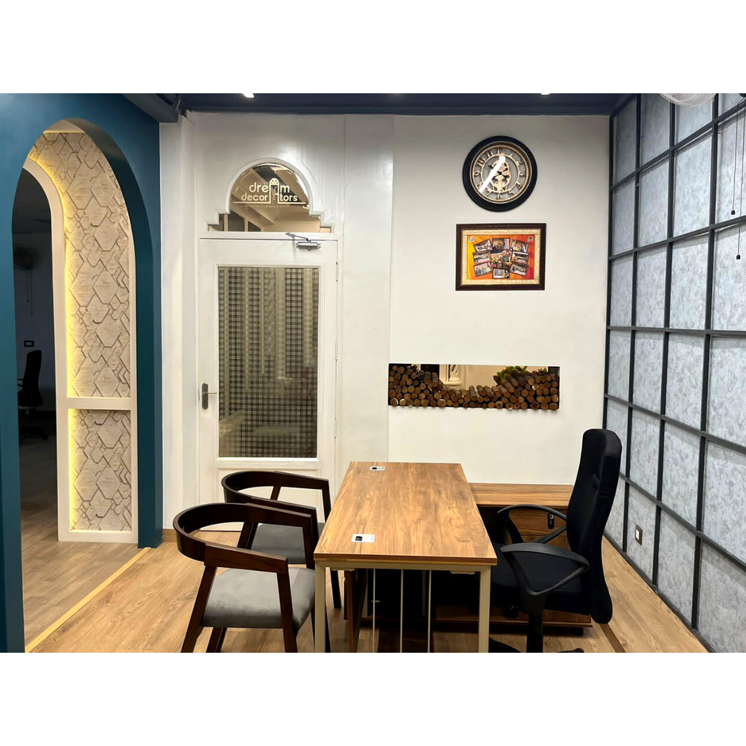 ✅ Minimalism with Warmth The vertical wooden slat panelling and natural tones create a rich, grounded backdrop — ensuring focus stays on the work, yet the ambience feels elevated.